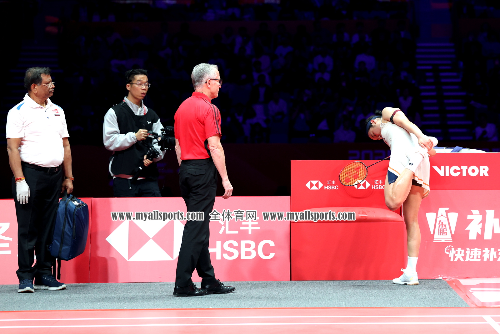 两人在决胜局体力明显下降,安洗莹在多拍对抗中逐渐压制王祉怡,把差距越拉越大。安洗莹在20比10领先时,一次网前扑击得手却被捉过网犯规,此时左大腿抽筋申请医疗暂停,却被禁止喷止痛剂。她随后坚持完成比赛,以21比10锁定胜局,赛后激动呐喊。