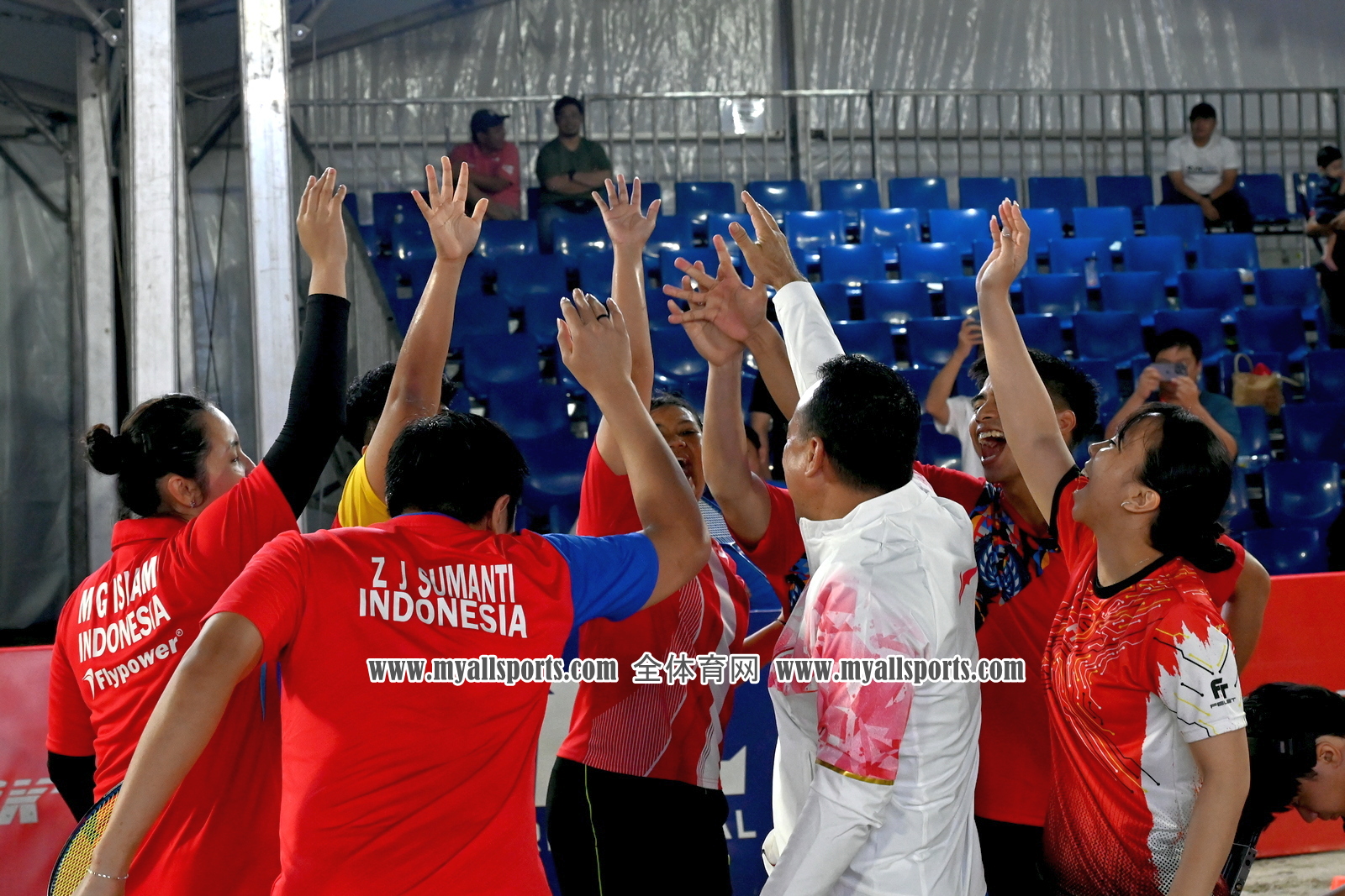 印尼在决赛以80比78险胜中国,以全胜姿态夺得在布城第4区运动休闲公园举行的世界沙滩运动会戶外羽球亚洲区入选赛混合团体接力赛冠军。