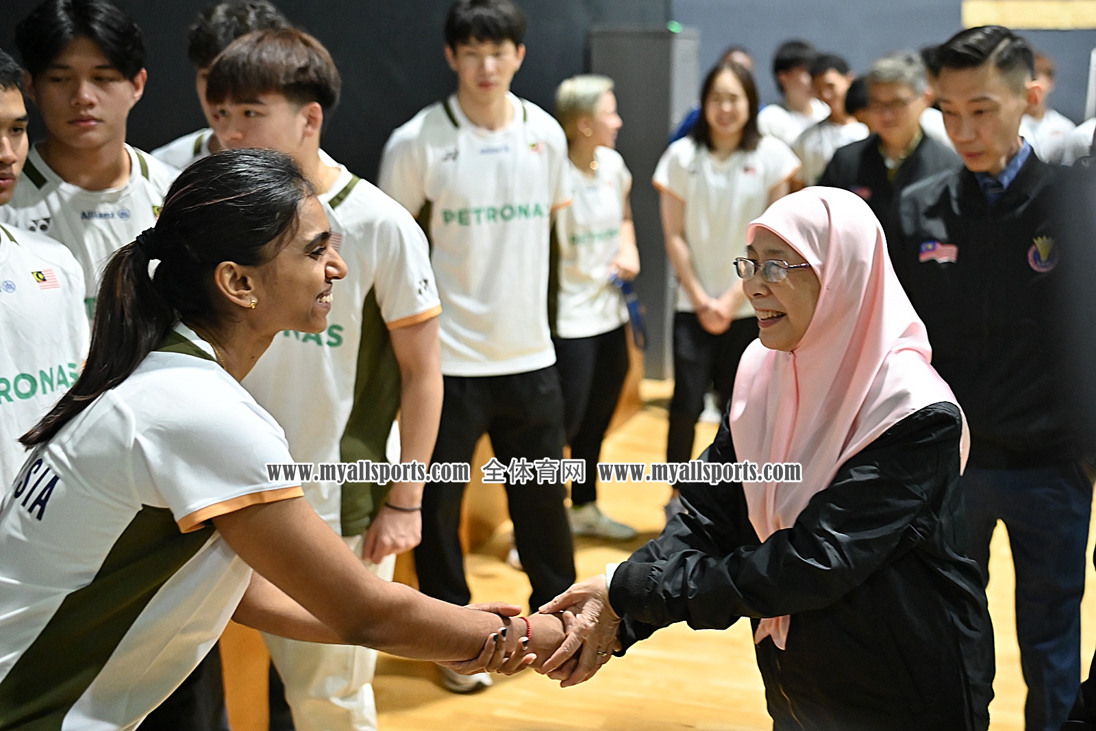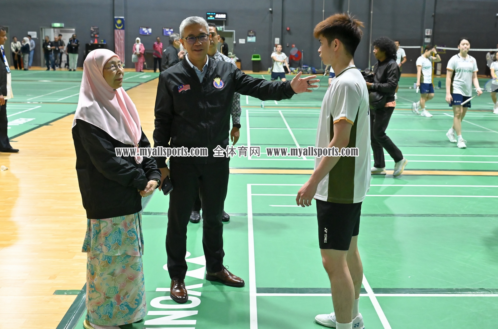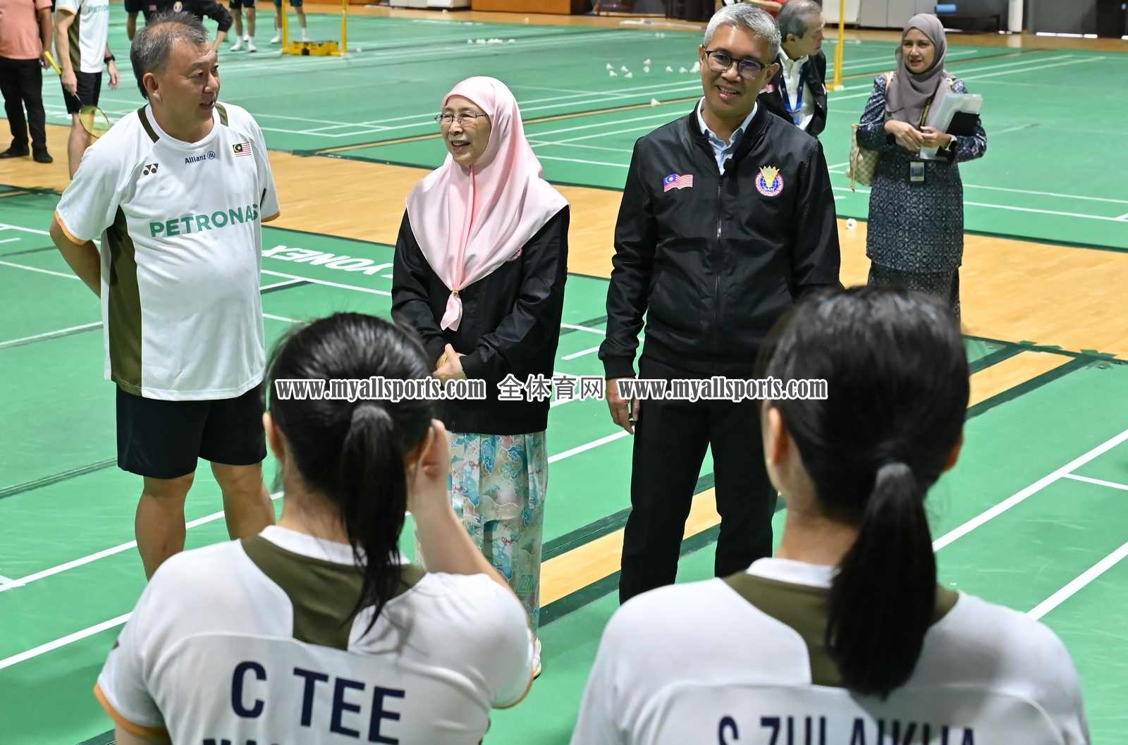 在大马国家羽球队备战多项重要赛事之际,担任大马羽总顾问的首相夫人旺阿兹莎到访大马羽球学院,为球员与教练打气和交流。