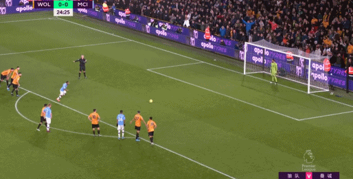第93分钟,斯特林禁区弧顶自由球直接射门打中横梁弹出,曼城难逃一败,惨遭狼队在本季双杀,而且在积分榜落后利物浦14分。